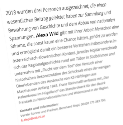 Für den „Beitrag zur Sammlung und Bewahrung von Geschichte im besten Sinne des Wortes“ und dafür, „nationale Spannungen dadurch abzubauen“, dass ich „ein differenziertes Bild jeweils auch der anderen Seite“ vermittle, erhielt ich vom „Tschechisch-Österreichischen Anti-Atom-Verein“ den „Sonne + Freiheit Anerkennungspreis 2018“. Ich, so der Verein, gebe „jenen Menschen eine Stimme, die sie sonst kaum hätten.“ Besonders wichtig ist mir, dass diese Stimme auch authentisch bleibt, dass sich die Zeitzeugen in meinen Büchern in ihrer Erzählweise und Sprache wiederfinden.